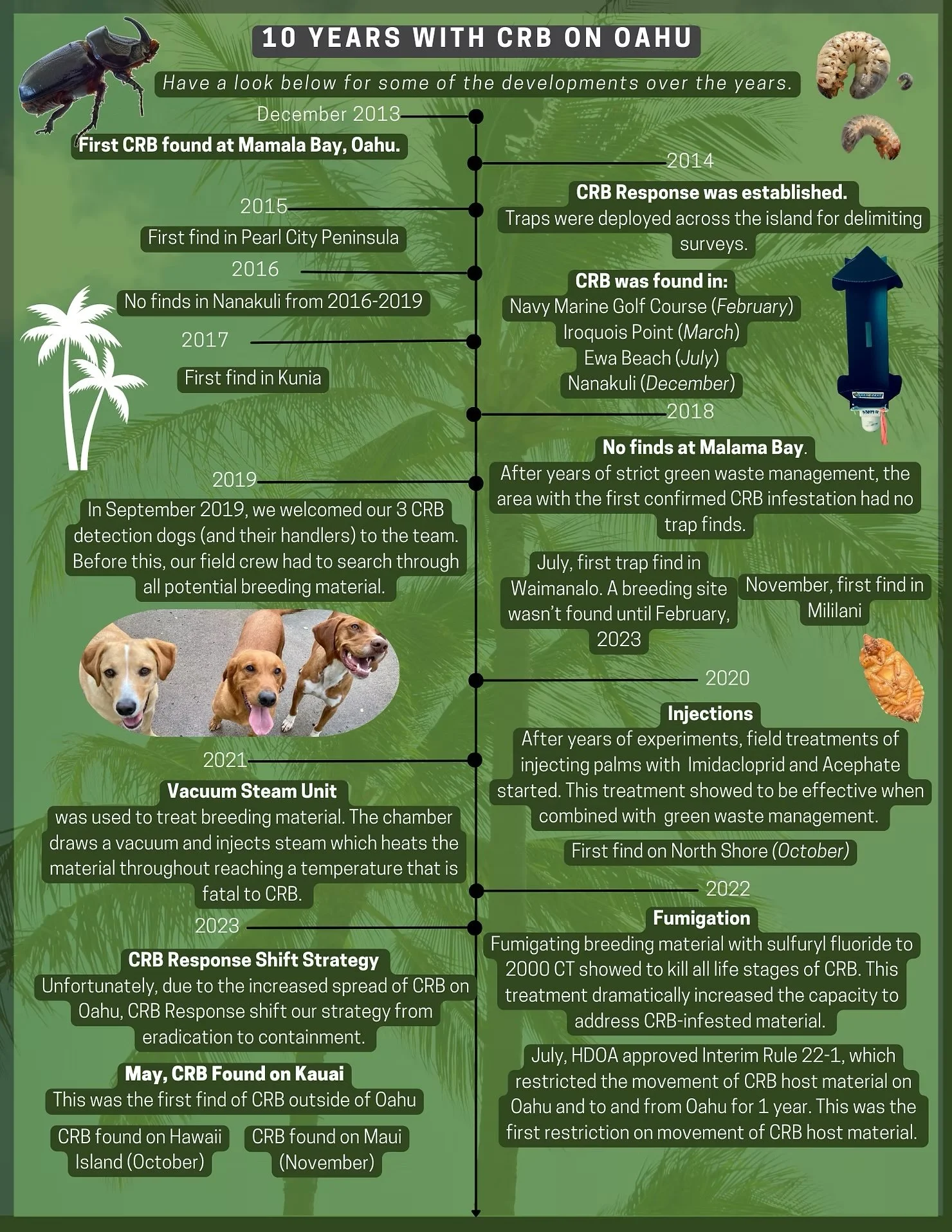 Efforts to combat this destructive pest are ongoing, with state agencies, researchers, and local organizations working together to manage its spread. However, the infestation has already led to the removal of hundreds of infested coconut trees, raising fears that Hawaii could lose its palm and coconut trees entirely if control measures fail. The loss would not only alter Hawaii's landscapes but also impact its ecosystem and cultural identity. By integrating indigenous management systems which include: biological control, mechanical systems, labeling and other methods to deter, detect, and trap the beetles. Adding the integration of community action, and education around identification and sanitization protocols, Hawaii aims to protect its coconut palms and prevent further damage. Together, we can preserve these vital trees and ancestors for future generations.
